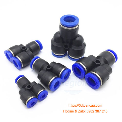 + Đầu nối nhanh chữ T phi 10mm: cả ba đầu đều dùng dây hơi khí nén phi 10mm